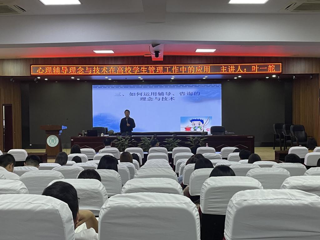 讲座中,叶一舵教授从理论高度上对当前学校心理健康教育工作面临的新形势、新任务做了分析,详细阐述了什么是心理辅导与咨询、为什么需要心理辅导与咨询、如何运用辅导、咨询的理念与技巧,以及辅导员可以怎么做等4个方面的知识内容,并运用实际案例,对学校心理健康教育工作的重心与方式、方法提出了指导性意见。他提出,要做好心理育人工作,辅导员必须提高意识与责任,能力与修养,积极践行,寻求支持与配合,并及时维护和促进自身的心理健康。