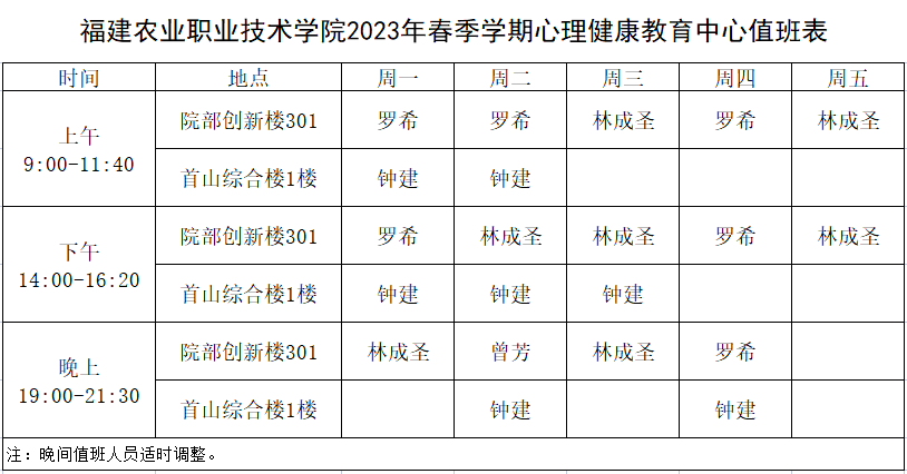 目前,心理中心面向全体师生开展个体心理咨询、团体心理辅导、情绪宣泄、箱庭体验、放松训练、心理素质训练、心理测评、职业就业咨询、朋辈心理咨询、危机干预等服务。下面是本学期心理中心值班表。