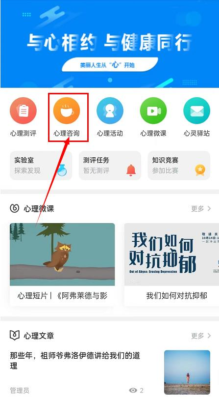1、通过“bat365在线登录网站注册赠送36心理中心”微信公众号进行预约登记。点击“心理咨询”;