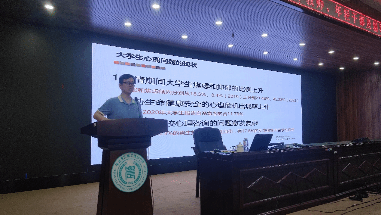 7月2日,我院邀请福建医科大学张书帏副教授在闽台楼二楼学术报告厅作题为“心理健康教育能力和素质提升技巧”的专题讲座。2023年暑期年轻干部、辅导员专题培训全体学员聆听了本次讲座。