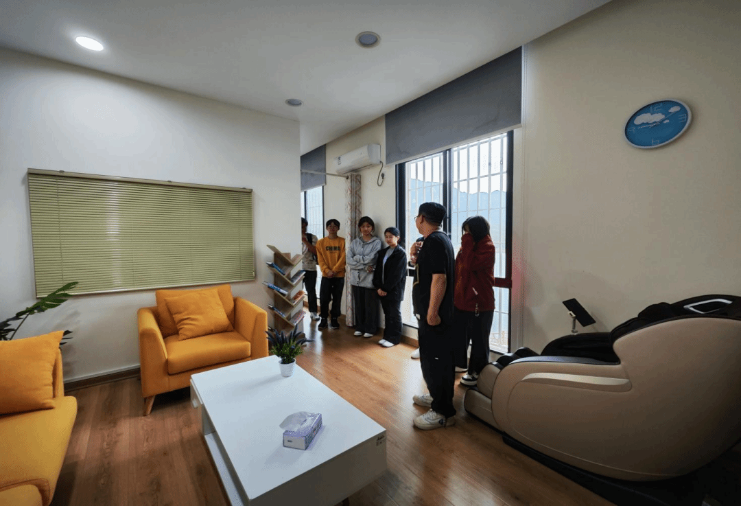 教师向参观的新生介绍心理健康教育中心