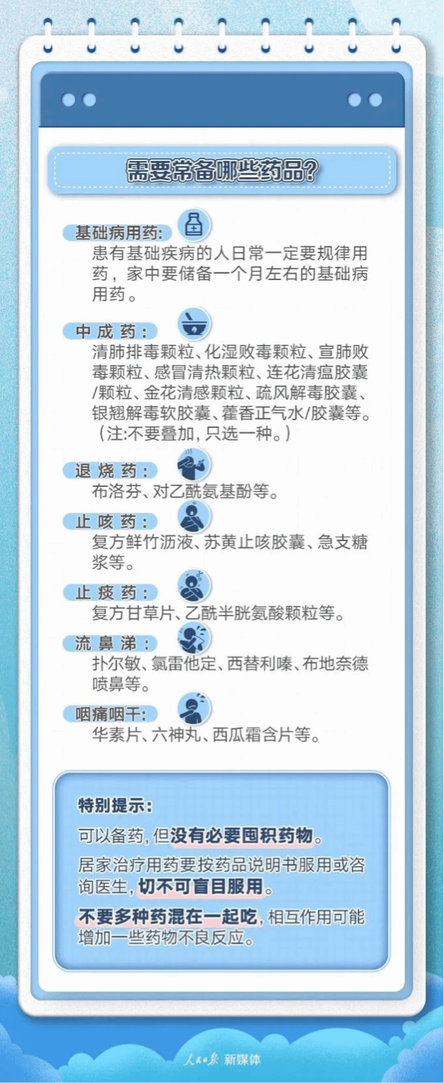 家里可以适当储备一些解热镇痛的日常药物,但没有必要去抢购。日常一定要规律用药,控制好病情,家中可储备一个月左右的基础病用药,按需适当储备抗原检测试剂。