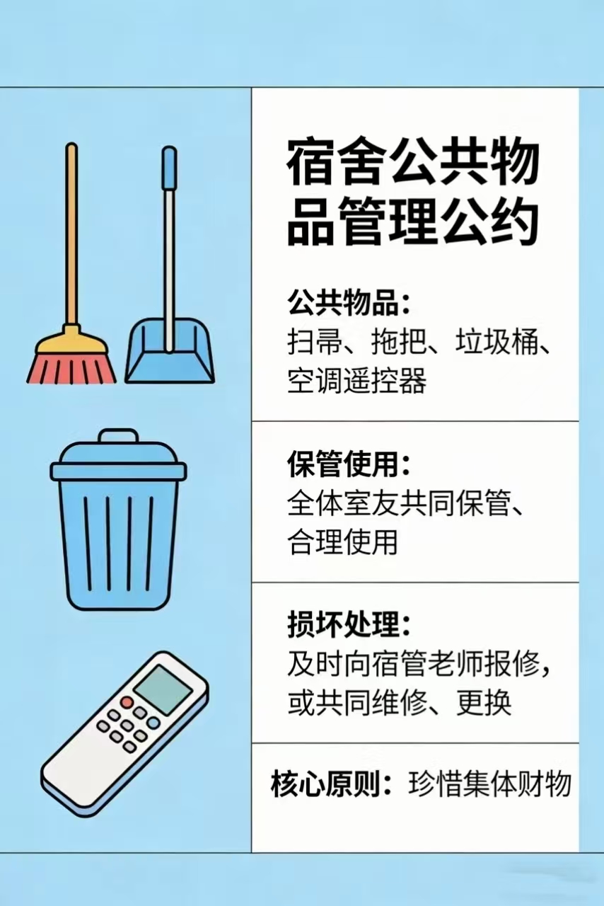 3.公共物品,妥善保管:宿舍内扫帚、拖把、垃圾桶、空调遥控器等公共物品,由全体室友共同保管、合理使用,若出现损坏,及时向宿管老师报修,或共同维修、更换,珍惜集体财物。