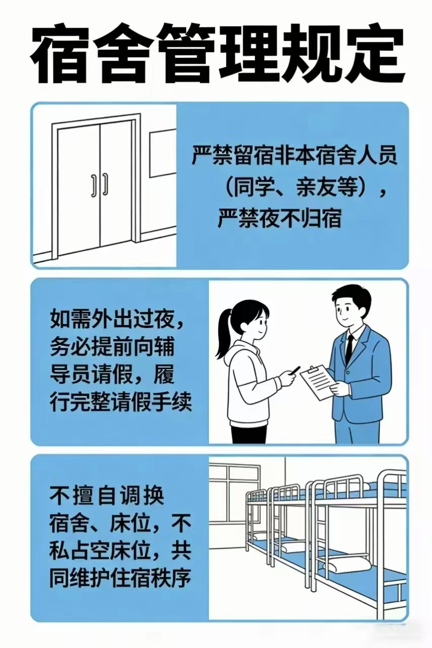 2.规范住宿,不越红线:严禁留宿非本宿舍人员(同学、亲友等),严禁夜不归宿;如需外出过夜,务必提前向辅导员请假,履行完整请假手续;不擅自调换宿舍、床位,不私占空床位,共同维护住宿秩序。