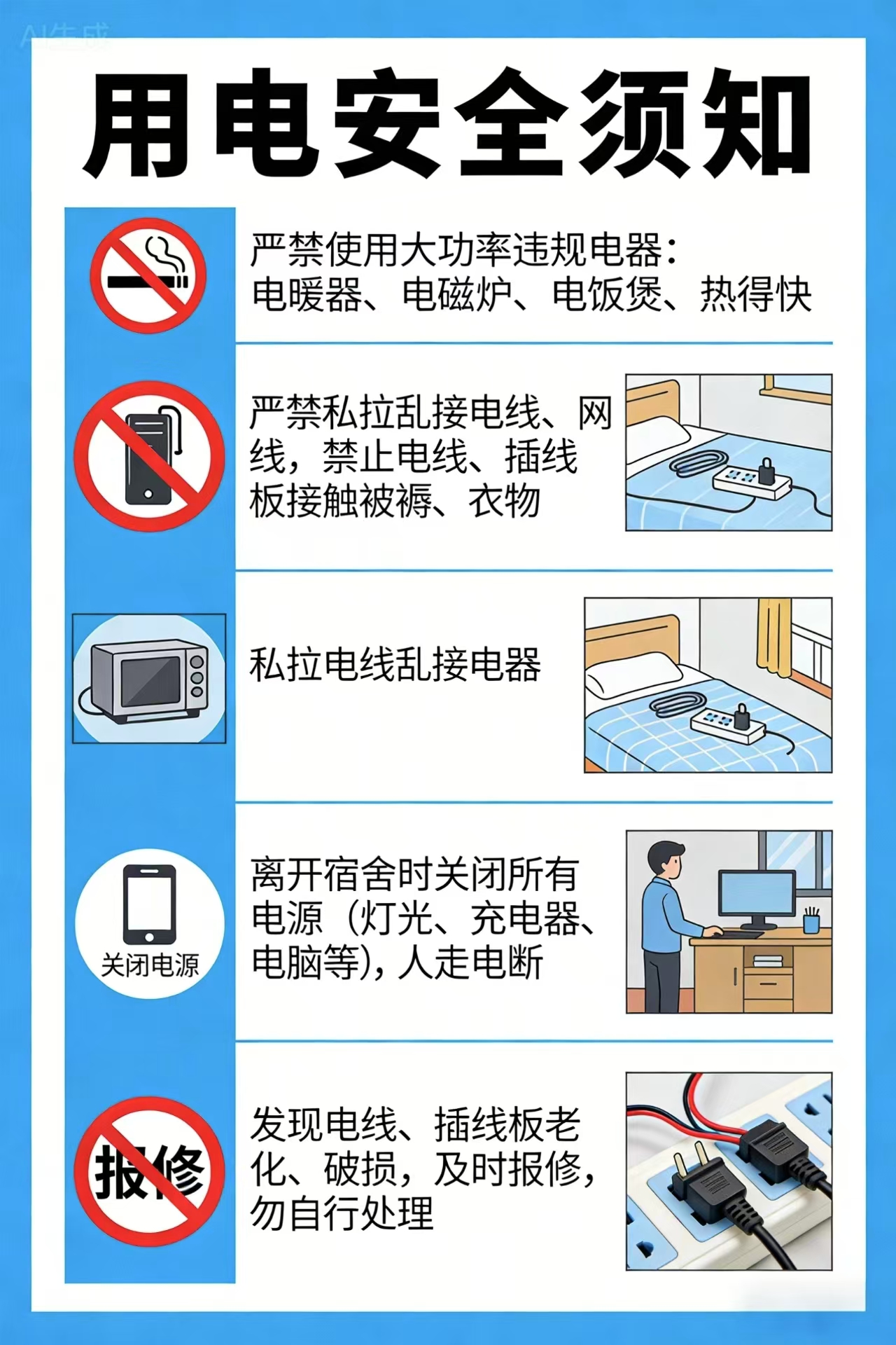 1.用电安全,杜绝隐患:严禁使用电暖器、电磁炉、电饭煲、热得快等大功率违规电器;严禁私拉乱接电线、网线,严禁将电线、插线板放置在被褥、衣物上,避免引发火灾;离开宿舍时,务必关闭所有电源(灯光、充电器、电脑等),做到“人走电断”;发现电线、插线板老化、破损,及时报修,切勿自行处理。