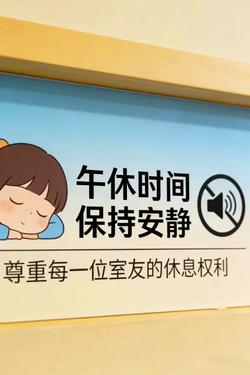 1.遵守作息,不扰他人:严格遵守学校宿舍作息时间,按时熄灯、起床;夜间熄灯后,不喧哗、不打闹,不使用手机、电脑、音响等外放声音,不进行熬夜打游戏、大声聊天等影响他人休息的活动;午休时间保持安静,尊重每一位室友的休息权利,互相体谅、彼此包容。