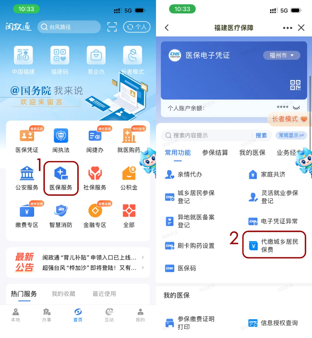 2.共济账户代缴:通过闽政通APP、“福建医疗保障”微信小程序办理福建省基本医疗保险家庭共济账户代缴居民医保费;或通过国家医保服务平台APP激活“医保钱包”,开通医保个人账户跨省家庭共济功能,代缴居民医保费。