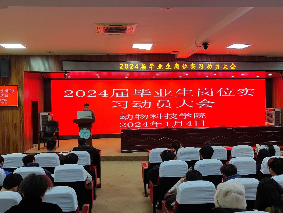 2024年1月4日下午,动物科技学院2024届学生岗位实习动员大会在闽台楼学术报告厅举办,学院胡美华副院长、林秋敏副院长,党总支纪检委员钟佳莲、毕业班辅导员及400多位2021级同学参加了动员大会,会议由教务办主任潘书磊主持。动员大会上,潘书磊老师对实习任务及要求进行布置和说明,为同学们详细介绍实习各阶段时间安排、实习指导老师安排,并对实习注意事项进行逐一讲解。辅导员刘小伟老师则针对就业协议书、推荐信、鉴定表以及职联网登记等事项进行了细致入微的解说,...