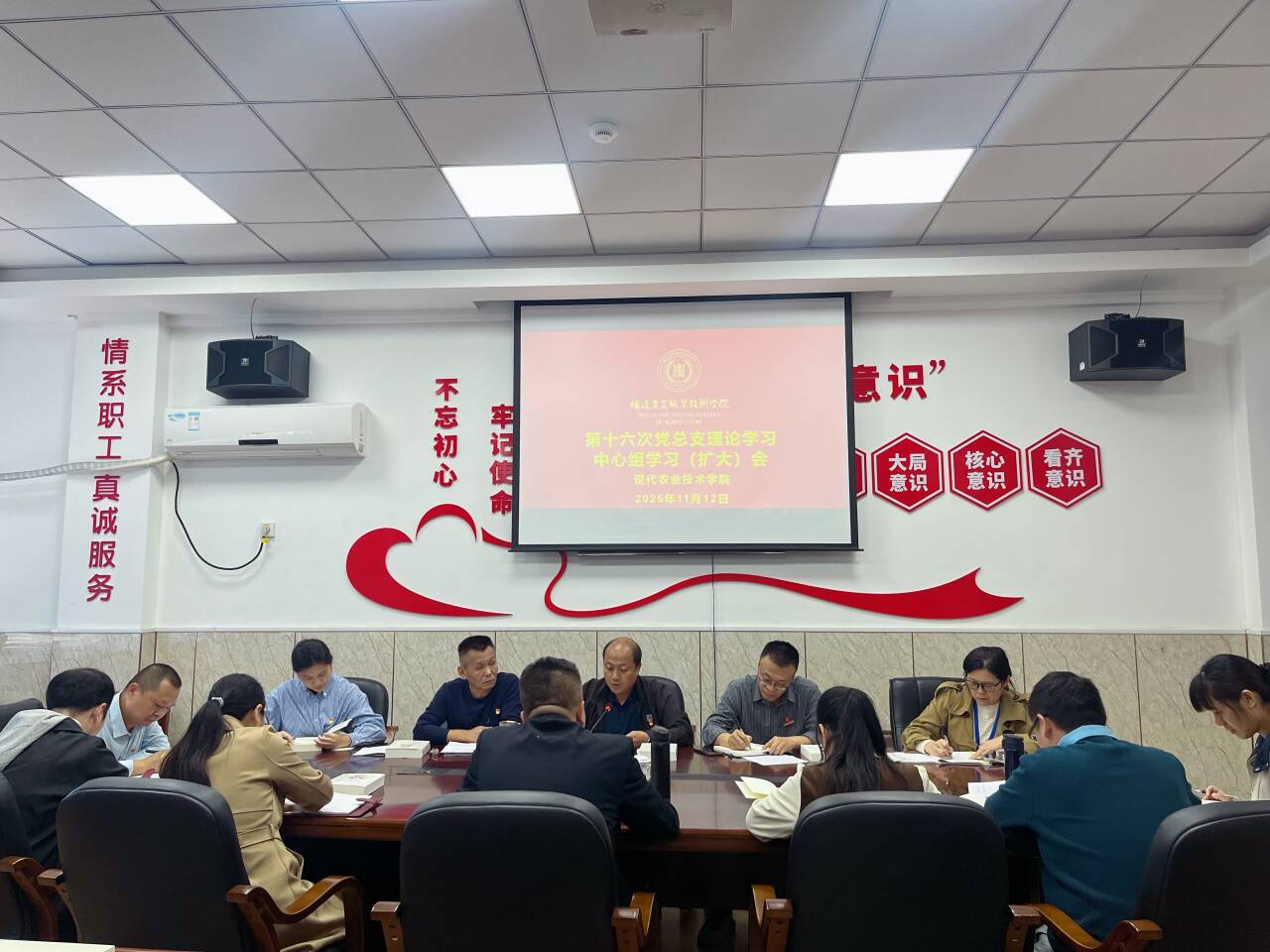 2025年11月12日,现代农业技术学院党总支召开2025年第十六次理论学习中心组学习(扩大)会,深入学习贯彻习近平总书记重要讲话精神,聚焦党的创新理论武装与学院高质量发展。会议由党总支书记欧高政主持,校党委委员、副校长严挺文巡听旁听指导。 会议现场 会议聚焦习近平总书记近期重要讲话精神和《习近平谈治国理政》第五卷,落实“第一议题”制度。学院党总支欧高政书记领学党的二十届四中全会公报和习近平总书记给中国农业大学全体师生的回信精神,...
