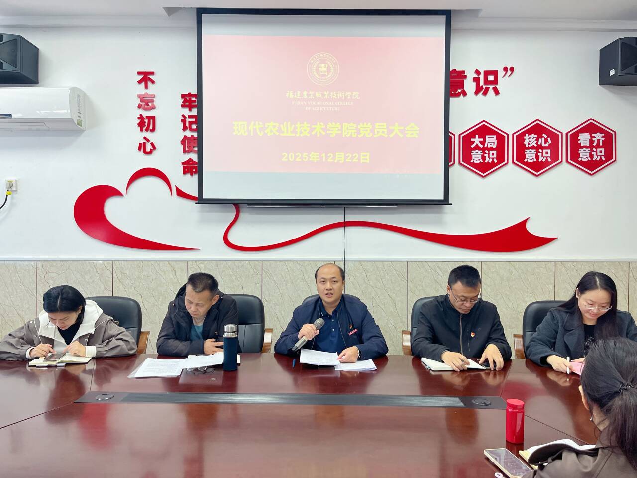 五年砥砺奋进,五年春华秋实,站在“十四五”收官与“十五五”启航交汇的关键节点,现代农业技术学院党的建设迈出坚实一步。2025年12月22日,现代农业技术学院在党员活动室隆重召开党员大会,举行换届选举大会。会议由党总支委员程晓琳同志主持。党员大会现场 大会在庄严的国歌声中拉开帷幕。首先由党总支书记欧高政通知代表上一届党总支委员会作工作报告,报告从五年耕耘硕果累累、对标对表检视短板、乘势而上再启新程等三个部分全面回顾了学院党总支在过去五年所取得的工作成效,...