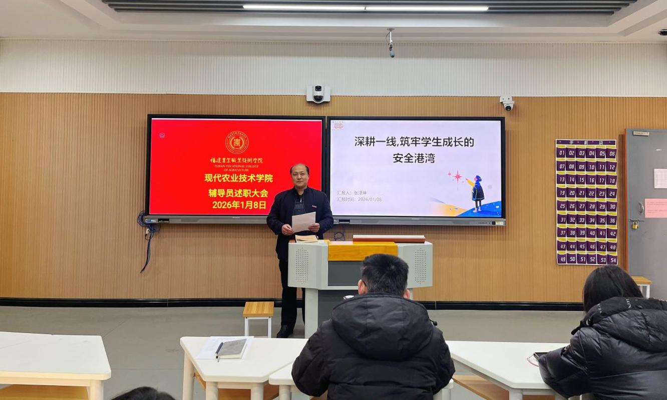 1月8日下午,现代农业技术学院在教(2)305教室召开2025年度辅导员述职会议。学院党总支书记欧高政、院长陈文胜、副院长冯冬林、党总支委员程晓琳及学生工作部学生管理科科长钟荣树参加会议。会议全面总结了过去一年学生工作取得的成效,深入交流辅导员队伍建设经验,研究探讨工作中存在的短板与对策,进一步推动学生工作提质增效和辅导员职业能力持续提升。