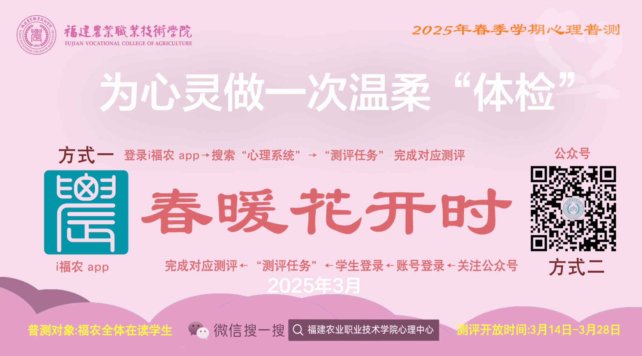 学院2025年春季学期心理健康普测工作于2024年4月9日顺利完成。本次活动覆盖9个二级学院、3个年级,参与率达100%。本次心理普测以“科学评估、精准服务、护航成长”为目标,通过建立专业化、标准化、系统化的心理测评、心理评估体系,为后续心理健康教育工作提供了精准数据支撑。心理普测宣传海报分层施策,全员覆盖本次普测工作由学生工作部牵头,心理健康教育中心、各二级学院心理辅导站负责实施,联合各二级学院辅导员、班级心理委员组建普测专项工作组,...