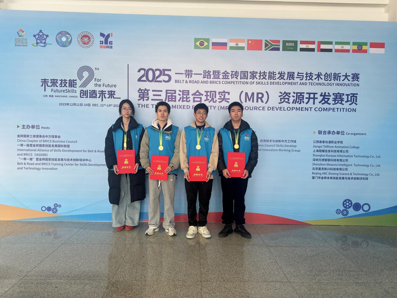 近日,2025年“一带一路”暨金砖国家技能发展与技术创新大赛第三届“混合现实(MR)资源开发”赛项全国总决赛圆满落幕。bat365在线登录网站注册赠送36信息工程学院学子不负众望,由黄君君、邓丽萍两位老师指导的2支参赛团队(蔡琰杰、胡潇文、杨志祥、李宗凯)凭借扎实的专业功底与创新的技术应用,双双斩获国赛一等奖(金牌);学院荣获“最佳组织奖”,2位指导教师获评“优秀指导教师”本次大赛以“技能合作创新,赋能金砖发展”为主题,聚焦混合现实、...
