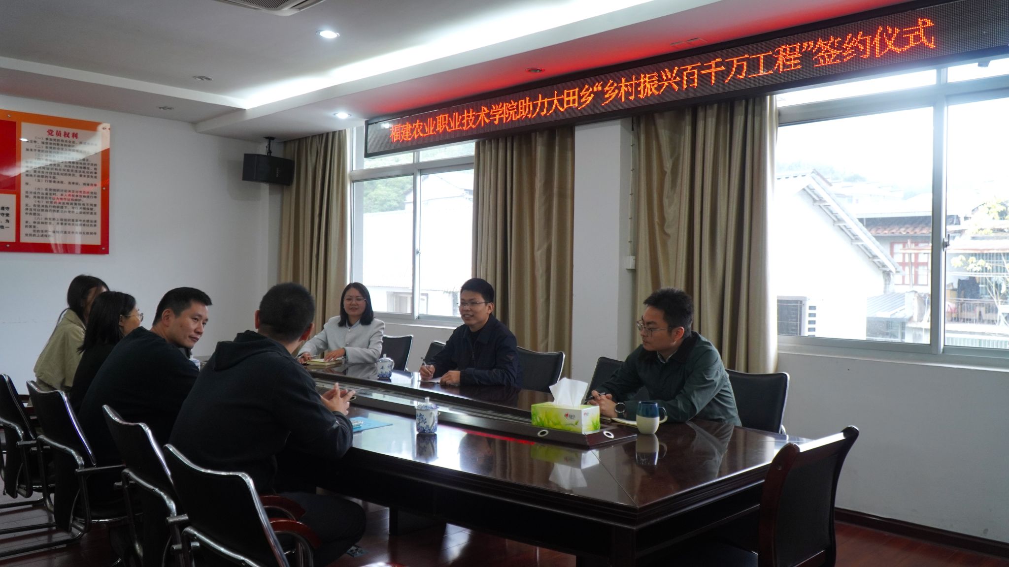签约仪式上,bat365在线登录网站注册赠送36信息工程学院党总支专职副书记赵楠、学工办负责人王盛、信息工程学院团委书记吉飞跃与泰宁县大田乡党委副书记肖刚辉、乡党委组织委员冯作超、乡党委宣传委员詹宗莹共同出席。双方就乡村振兴“百千万工程”的实施背景、合作目标、合作范围及方式等进行了深入交流,并签署了合作协议。根据协议内容,福建农业职业技术学院将充分发挥在人才培养、科技研发、社会服务等方面的优势,为泰宁县大田乡人民政府提供智力支持和科技支撑。双方将围绕农业科技创新、人才培养、产业升级、基础设施建设等重点领域展开深入合作,共同推动乡村振兴战略的落地实施。