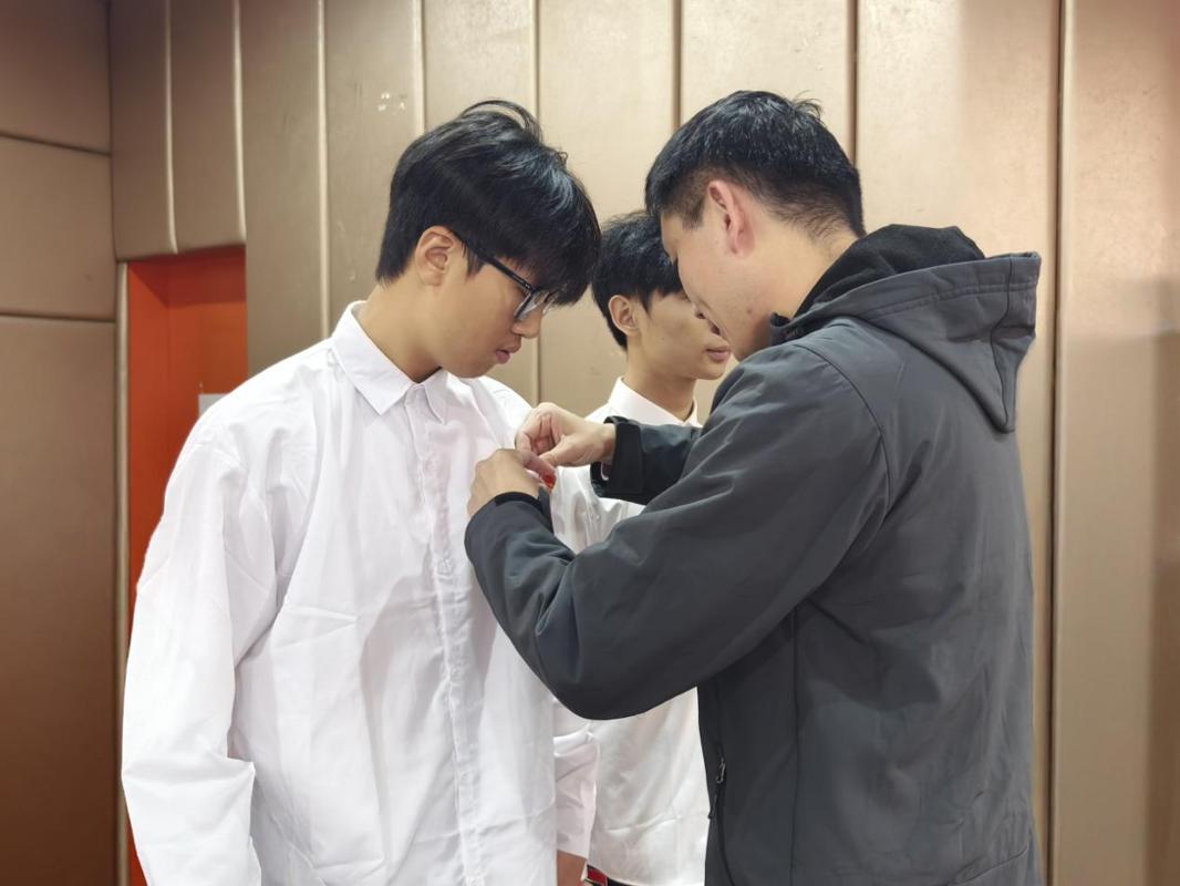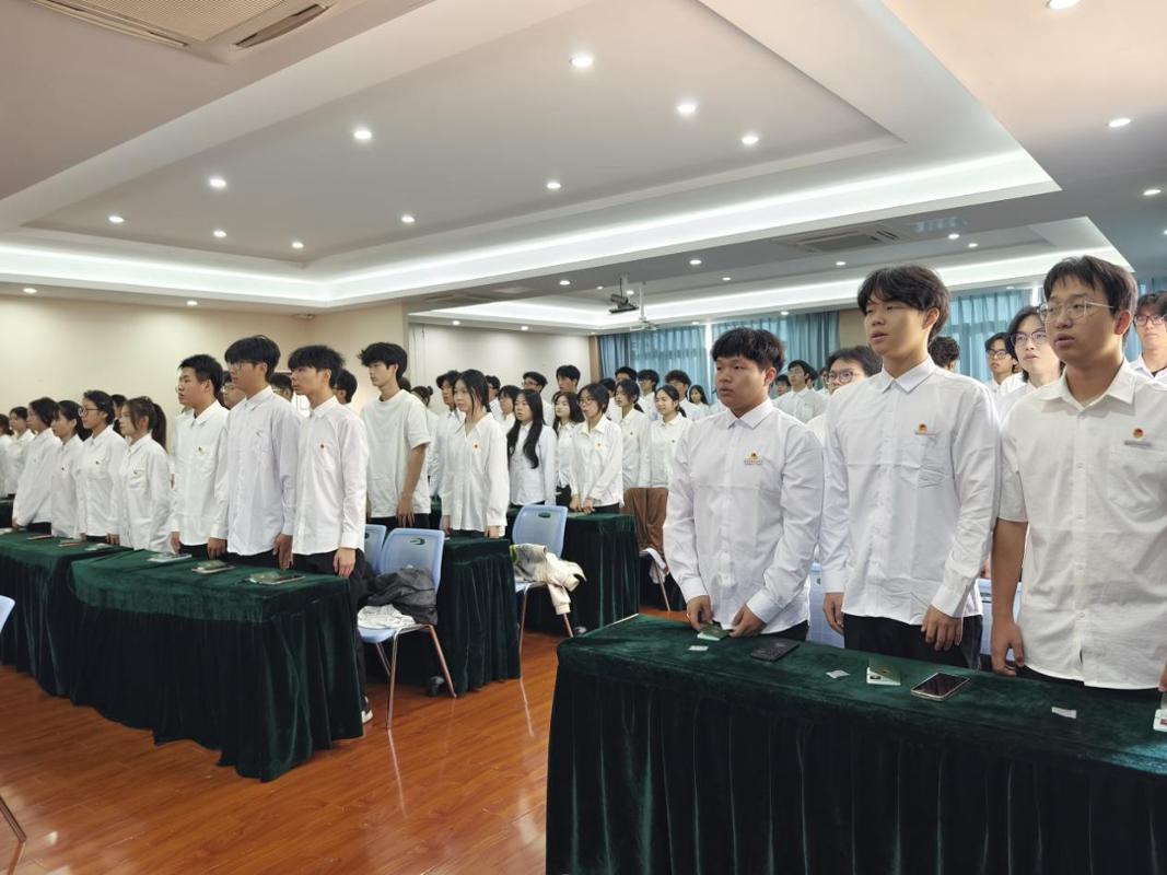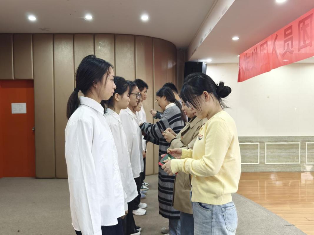 仪式在庄严的国歌声中拉开序幕。罗雪琴老师郑重宣读新团员名单并阐释了团员权利与义务,随后,学院老师共同为新团员代表颁发团员证、佩戴团徽。