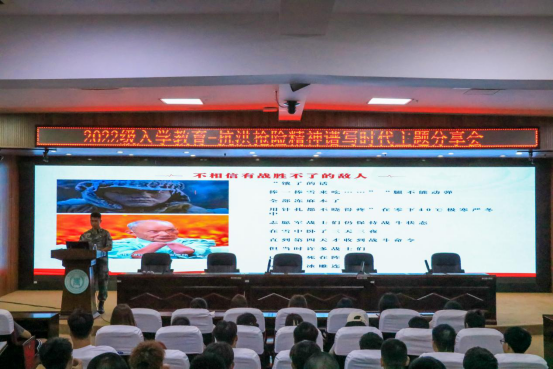 郭铭旺同学结合自己抗洪的经历,用朴实生动的语言,从不同的角度、不同的侧面讲述了解放军人在抗洪救灾时秉持“万众一心、众志成城,不怕困难、顽强拼搏”的理念,主动担当作为,连续奋战数个日夜,全力保障人民群众生命安全的动人事迹。随后用实际案例和视频分享,以抗洪英雄李向群为典型代表,从不同角度讲述抗洪英雄在“抗洪”期间的难忘故事、感人瞬间,展现广大军民面对危险始终不屈不挠,表现出惊人的勇气和毅力,联合自身的事迹,激起2022级新生的强烈共鸣。
