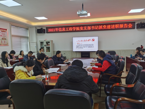 为进一步加强学院党建工作、层层压实管党治党主体责任,2022年1月5日下午3点10分,我院在党员活动室召开2021年信息工程学院党支部书记抓党建述职报告会,学院党总支书记、各党支部书记以及全体党员参加了报告会,会议由学院党总支书记陈克银主持。