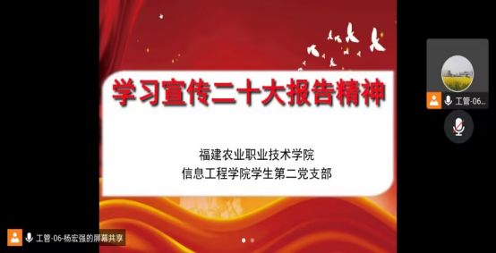 2022年11月4日,信息工程学院学生第二党支部组织支部全体21名师生党员开展学习宣传二十大精神主题党日活动。因疫情原因,此次活动采取线上腾讯会议的形式召开。