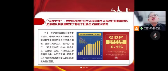 会上,首先由学生第二党支部书记杨宏强同志介绍了二十大报告召开的时代背景,领学了二十大报告的主要内容,详细叙述了十年来以习近平同志为核心的党中央团结带领全党全军全国各族人民撸起袖子加油干、风雨无阻向前行,完成脱贫攻坚、全面建成小康社会的历史任务,实现第一个百年奋斗目标的历史宏伟征程,重点阐述了党的二十大科学谋划未来五年乃至更长时期党和国家事业发展的目标任务和大政方针。