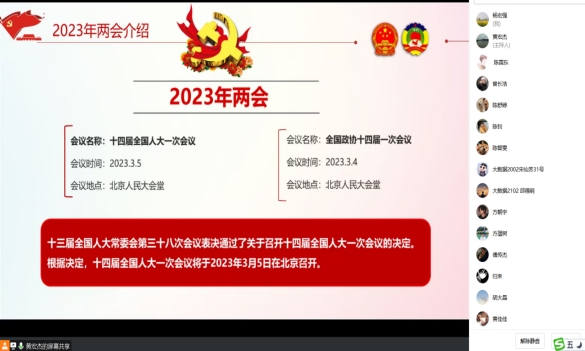 党课上,黄宏杰副书记领学了2023年“两会”内容和政府工作报告,他希望支部师生党员们一要主动学习贯彻习近平总书记系列重要讲话精神、党的二十大精神和全国“两会”精神,做到“真学”“会用”,承担起应有的时代责任与担当;二要努力学习专业知识,发挥专业优势,提升就业竞争力,主动将个人理想融入党和国家发展事业中,坚定理想信念,提高政治站位,以实际行动为中国式现代化建设贡献一份力量。与会师生党员认真聆听,积极进行线上互动,表示将从自身做起,关注时事热点,学好专业知识,锤炼技能本领,为祖国的经济社会建设贡献青春力量,把学习宣传贯彻党的二十大精神和“两会”精神落到实处。