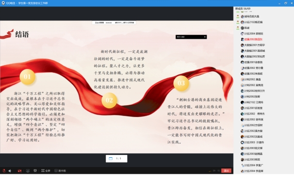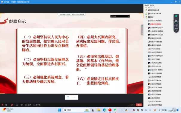 2023年7月28日晚,信息工程学院学生第一党支部通过线上方式开展学习贯彻习近平新时代中国特色社会主义思想主题教育。会议由学生第一支部书记王盛主持,全体师生党员参与学习。