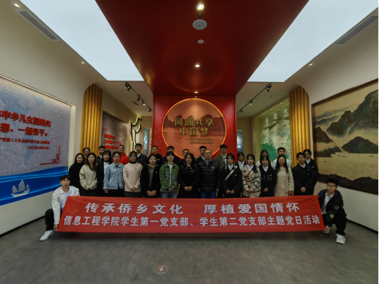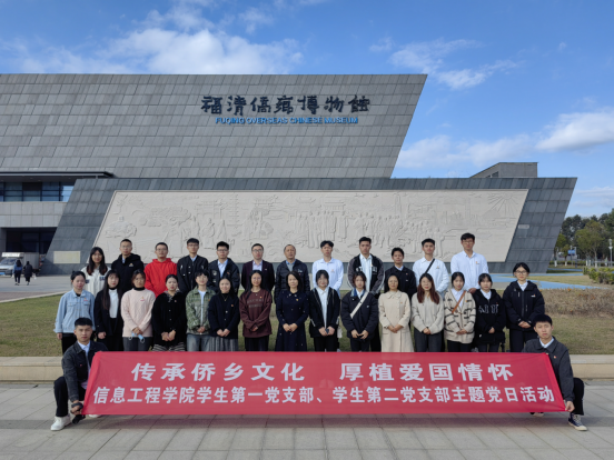为进一步巩固深化党史学习教育成果,加强新确定入党积极分子理想信念和爱国主义教育,端正入党动机,赓续红色基因,汲取奋进力量,推进党支部“主题党日”活动和入党积极分子教育全面开展,结合学院实际,信息工程学院组织党员教师以及2023年下半年新确定发展对象于11月21日赴福清侨乡博物馆、福建技术师范学院(五马山校区)、福清福和万达影院开展“传承侨乡文化,厚植爱国情怀”主题党日活动。