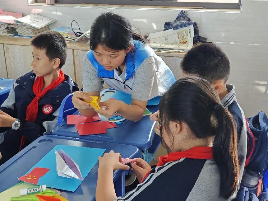 随后,志愿者们带领同学们以童心绘制国旗,用色彩点亮爱国情,在折纸飞机环节中,同学们展现出了属于他们年纪的活泼与快乐,每一架纸飞机都承载着他们对未来的希望和对英雄精神的承诺。