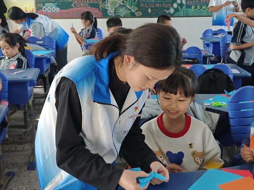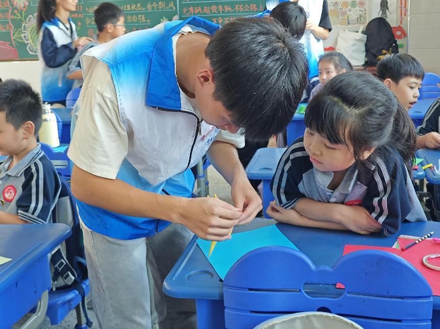 (志愿者指导小朋友制作手工作品)