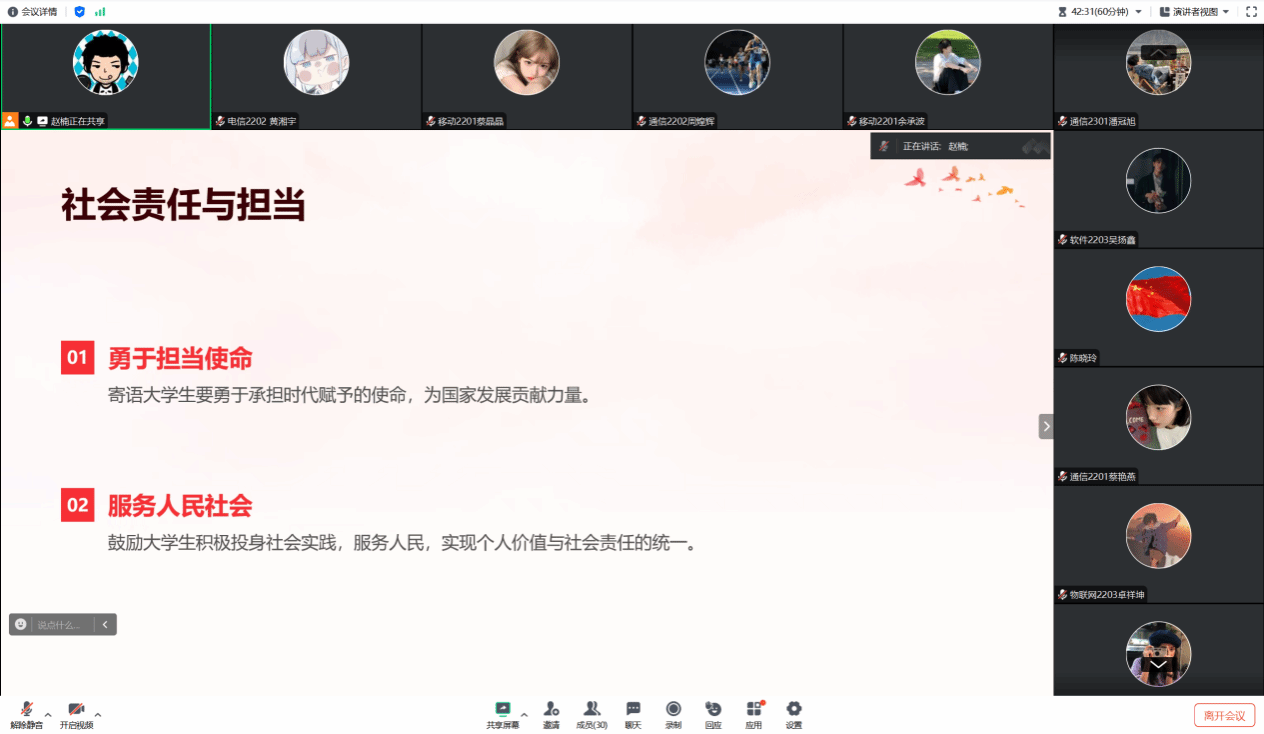 在党课中,专职副书记赵楠分享了习近平总书记与大学生朋友们的交流内容,并深刻强调了习近平总书记对青年一代的殷切期望,“青年兴则国家兴,青年强则国家强”这一重要论述,深刻揭示了青年与国家命运之间的紧密联系,为广大青年指引了前进的方向。专职副书记赵楠还深情转述了习近平总书记在与大学生们交流时,分享的个人成长经历,激励青年学子要成为“有理想、有本领、有担当的新时代好青年”。最后,专职副书记赵楠号召全体党员要牢记习近平总书记的殷切嘱托,始终保持青年学子的热情与动力,在奋斗中实现个人梦想,并在国家和民族的伟大复兴中找到自我价值。