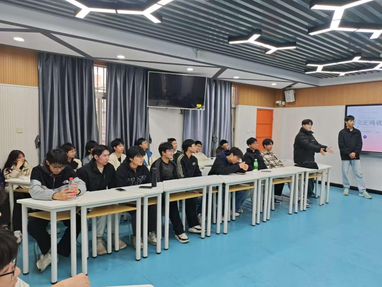 本次活动以线下讲解和线上视频方式进行,内容覆盖了包括准确选择职业发展方向、明确就业目标、健康态度面对就业压力、注重自身素质提升、积极参与就业指导和招聘活动、持续学习与自我提升等多个维度,全面深入地讲述了如何树立正确的就业观。同学们认真学习并就“就业与择业”一题展开讨论。