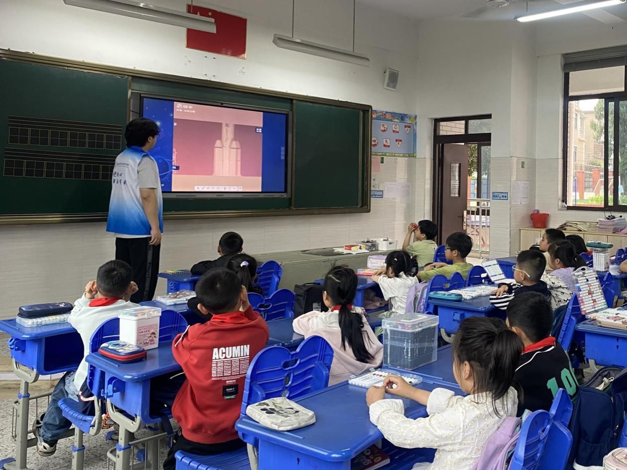 活动当日,志愿者们以饱满的热情和专业的素养投入到教学中。在“中国航天日”主题讲解环节,志愿者通过精彩的视频向同学们介绍了中国航天发展历程中的重要事件、关键突破,以及设立“中国航天日”对激励航天事业发展、弘扬航天精神的重要作用。同学们积极参与互动踊跃回答问题,现场气氛热烈。