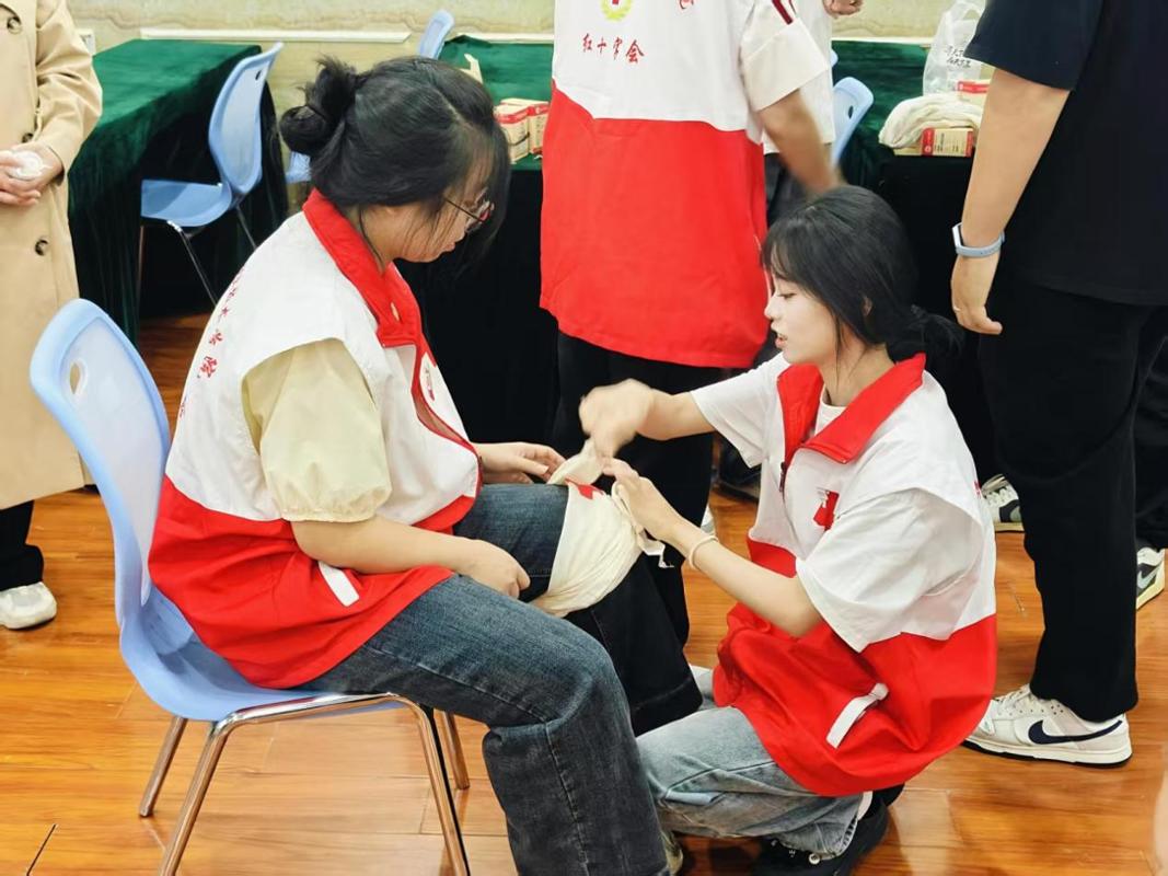 活动现场,“青盾”禁毒宣讲团的志愿者先是向同学们介绍了各式各样的毒品种类及预防措施,又通过生动的案例讲解和实操演示,向同学们传授了心肺复苏、海姆利希急救法、绷带包扎以及三角巾包扎等关键急救技能。志愿者详细讲解每项技能的操作要点,并结合实际案例,让同学们理解急救知识在生活中的重要性。