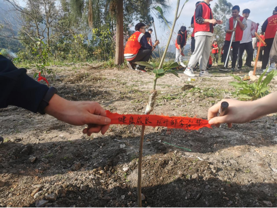 (老师们细心为树苗系上祝福)