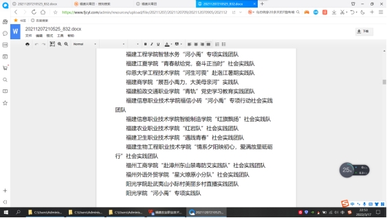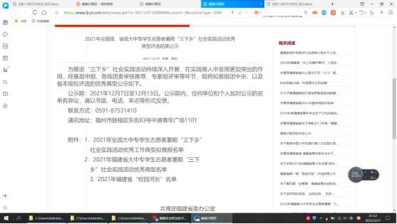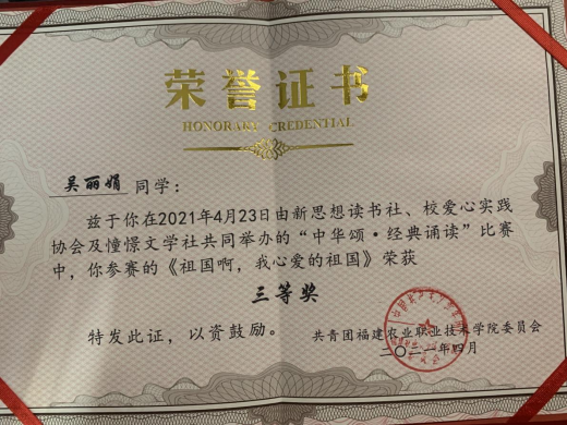 该生始终相信学无止境,优秀自己才会有收获,在2020-2021参加社会服务实践,2021年所在团队“红岩队”荣获全国大中专学生志愿者暑期“三下乡”社会实践荣获团体优秀团队奖。