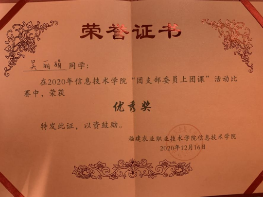 在担任计算机应用技术2006班班长、计算机应用技术2104班班导、信息工程学院团总支副书记期间,该生不仅努力做好自己的本职工作,并在工作中抽出时间积极参加各项文体活动充实自己的学校生活。2021年bat365在线登录网站注册赠送36“中华颂•经典诵读比赛”荣获三等奖;2021年信息工程学院庆祝建党一百周年五四大合唱比赛荣获表彰;2021年第十九届校田径运动会荣获“女子三级跳远”第五名;2020年信息工程学院“团支部委员上团课”获得优秀奖等等。