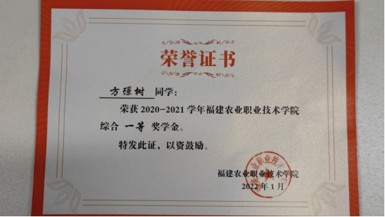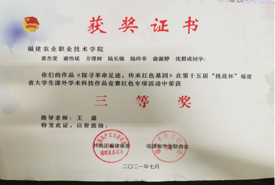 该生从不松懈学习,坚信学习才能够充实自己,在2020-2021参加第十五届“挑战杯”福建省大学生课外学术科技作品竞赛,所在团队作品《探寻革命足迹,传承红色基因》在红色专项活动中荣获三等奖。该同学态度端正,刻苦学习,努力务实,合理分配学习和工作的时间,2020-2021学年学习成绩班级第二、综合成绩班级第一,荣获2020-2021学年荣获“一等奖学金”。