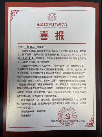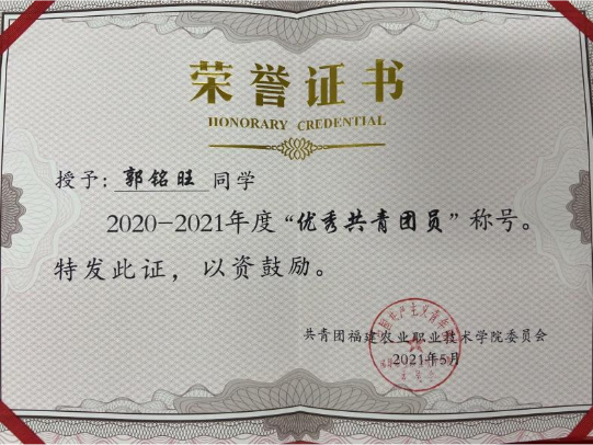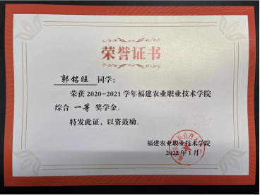 该生在校期间各方面表现优异,是一名品学兼优、全面发展的大学生。累计获得省级荣誉1项,校级荣誉10项,院级荣誉9项为人诚恳,严于律己,做事积极,责任心强,在疫情期间积极参与所在地的疫情防控工作,在学院和班级起到了一定的模范带头作用。