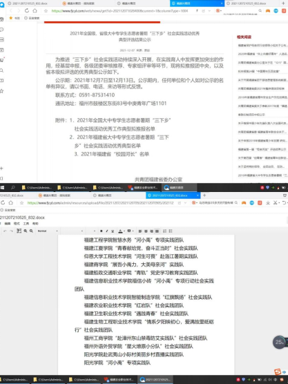 暑期他积极参加社会服务实践,在2021年所在团队“红岩队”荣获福建省大中专学生志愿者暑期“三下乡”社会实践优秀团队。