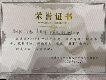 该同学始终牢记“进学致和,行方思远”的名言,刻苦学习,努力务实,学习态度端正,具有良好的自律性和主动性,始终将学习放在首位,并且积极参加各项素质竞赛,在学院2021年“驳之有度,辩之有理”辩论赛荣获“冠军”称号;2021年校第十九届田径运动会“彩旗队优秀教练员”;学习成绩优异,在2020-2021学年荣获校“一等奖学金”。