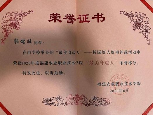 该生始终以踏实做事、不空想、不需声为目标。在担任信息工程学院学生会主席团成员、国旗护卫队负责人期间负责各项活动的组织、开展。在2020年度荣获bat365在线登录网站注册赠送36“最美身边人”荣誉称号;2020-2021学年荣获校“优秀共青团干部”称号;2021-2022年度荣获校“青年志愿服务优秀个人”;2020-2021年度荣获校“优秀共青团员”称号;2020-2021学年荣获“校三好学生”荣誉称号。