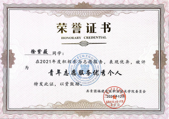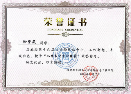 该生始终保持热情开朗,尊敬师长,工作勤奋,尽职尽责的态度。在担任信息工程学院学生分会分管主席一职期间,坚持理论联系实际,时刻严格要求自己,督促自己,将“使命在心、责任在肩、奋斗有我”牢记于心。该生始终怀着饱满的热情积极组织参与学院各项活动,并荣获2021年共青团bat365在线登录网站注册赠送36“优秀共青团员”称号;荣获2021年共青团bat365在线登录网站注册赠送36“青年志愿服务优秀个人”;荣获2021年“优秀学生干部”;荣获2021第十九届校运会”优秀教练员”称号;荣获2020年信息工程学院“团支书委员上团课”二等奖;荣获2021年信息工程学院“大学生返家乡”社会实践荣获“优秀团队奖”;荣获2021年在信息工程学院“迎百廿校庆,展社团风采”中获“社团积极分子”;荣获2021年信息工程学院“写给志愿者的三行情书”三等奖等多项荣誉。