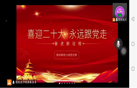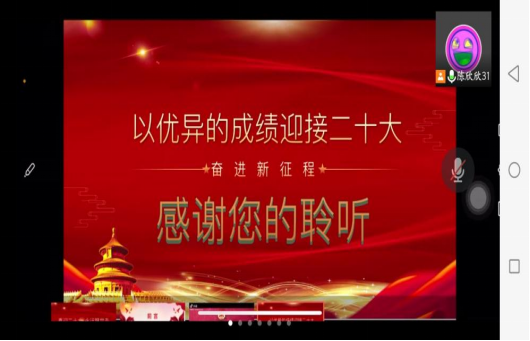 活动期间,物联网技术应用2102班团支书缪玮杰通过线上讲解PPT的形式,借助南开大学的校训和南开大学张伯苓校长的爱国三问为同学们普及了中共二十大召开的重大意义,让同学们对中共二十大的召开有了更清楚的认知,把个人理想追求融入党和国家事业之中,立足本职、脚踏实地,主动作为,在自己的岗位上发光发热,努力成长为合格的社会主义建设者和接班人。