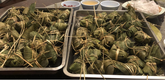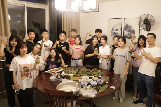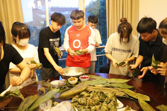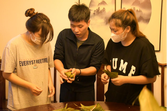 活动现场,颗粒饱满的糯米、蜜枣、红豆、虾仁粽叶等原材料整齐地摆放在桌子上,大家摩拳擦掌、跃跃欲试。粽子虽小,门道不少,一捧糯米、三两张粽叶、几个红豆、虾仁,粽叶卷成漏斗状后,舀糯米,到封口绑绳子定型……几位少数民族同学在老师同学们的指导下包起了棕子。大家互相讨教切磋,不断学习,手法从生疏到熟练,其中不断有奇异形状的粽子出现,让人忍俊不禁,现场欢声笑语不断,尽情渲染着端午的节日氛围。经过努力,各式各样的粽子在一双双巧手中诞生了,满满一桌的粽子让整个食堂都填满了浓浓的端午气息,也让异乡的同学感受到浓浓的端午情和家的温暖。一段欢乐的包粽子环节结束后,同学们品尝了自己的劳动成果,总有几个粽子又甜又咸,引得同学们哭笑不得。