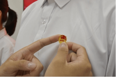 (老团员为新团员佩戴团徽)