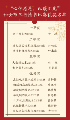 “谁言寸草心,报得三春晖”。千百年来,奔赴山海的道路上从不乏女性的身影,她们温柔坚韧,于时光的洪流中熠熠生辉。时逢妇女节,我院特举办“心怀感恩,以暖汇光”三行情书征集活动,活动一经通知便收到同学们的热情投稿,共收货66份投稿作品,接下来让我们一起欣赏优秀作品,看盛意满山河吧!