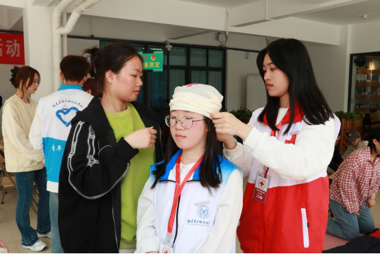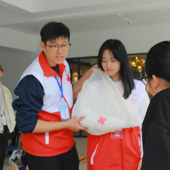 其中,我校志愿者现场演示三角巾包扎,并指导师生亲身实践,加深了师生对相关应急救护知识技能的理解。此次义诊活动也得到了我校领导的肯定。