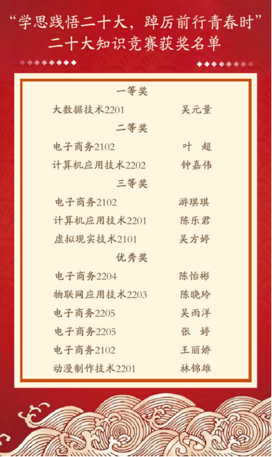经过激烈角逐,吴元量同学获得一等奖,叶超、钟嘉伟同学获得二等奖,游琪琪、陈乐君、吴方婷三位同学获得三等奖,陈怡彬等6位同学获得优秀奖。此次活动旨在进一步调动学生学习党的二十大精神的积极性,营造比学赶超的氛围,把党的二十大精神融入到生活中、学习中、工作中,努力学习科学文化知识,提升个人修养,展现当代大学生的精气神,共同营造良好学风、校风,以更加自信的姿态砥砺奋进新征程。