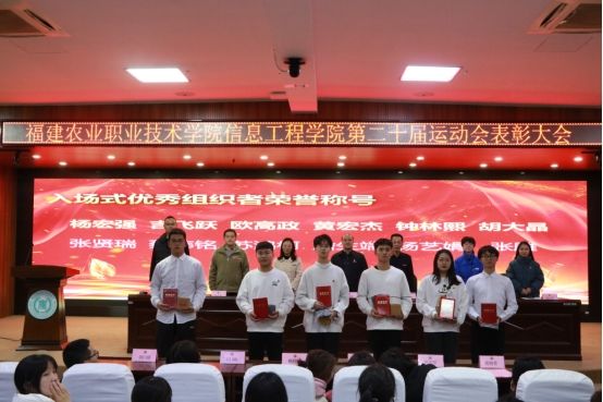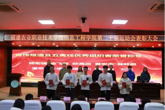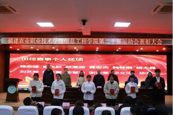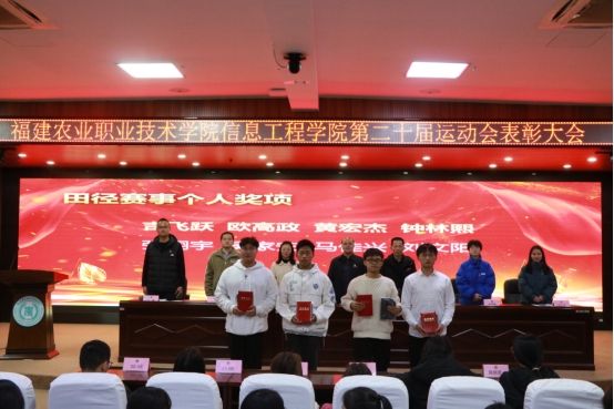 接着周俐君老师宣读了《信息工程学院关于第二十届校田径运动会表彰的决定》,在场全体领导老师为获奖人员颁发荣誉证书与特色奖品。