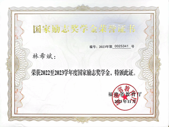 在校期间,她勤奋好学,刻苦钻研,取得了优异的成绩,在大一综测成绩位居班级排名第一,被评为三好学生,荣获国家励志奖学金。除了学好专业知识之外,她也不断通过参加各项活动来开拓自己的思维和视野,提高自身的综合素质。并获得福州市花卉行业职工插花竞赛优秀奖,第二届“中国农民丰收节”三等奖劳动进士奖,“担当时代责任,传承五四精神”征文活动优秀奖等17项荣誉。