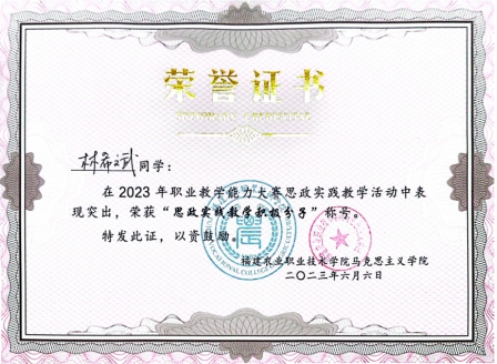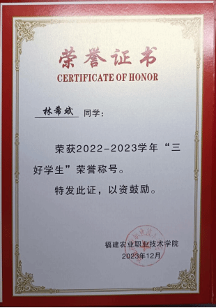 该生作为一名共青团员,思想端正,能吃苦耐劳,注重个人修养,在校时认真完成“青年大学习”网上主题团课,完成率100%。先后参加2022年院青年马克思主义者培养工程培训、2023年校青年马克思主义者培养工程。并荣获2023年6月福建农业职业技术学院马克思主义学院职业教学能力大赛“思政实践教学积极分子”。